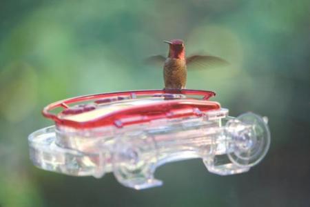 Colorful top to attract hummingbirds. Easy to clean. Built in ant moat. Can accommodate Hummingbird Nectar Guard Tips. Attaches to window with two suctions cups. 8oz capacity. Lifetime guarantee.