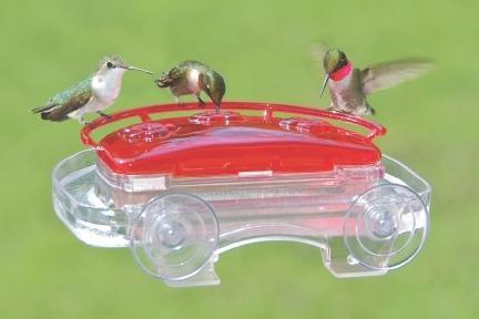 Colorful top to attract hummingbirds. Easy to clean. Built in ant moat. Can accommodate Hummingbird Nectar Guard Tips. Attaches to window with two suctions cups. 4oz capacity. Lifetime guarantee.