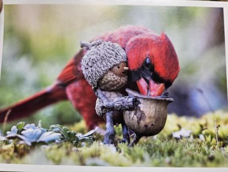 Note cards featuring Becorns; human like creatures made from natural materials, created by David Bird and placed in natural settings. Birds and squirrels are photographed interacting with the Becorns in images taken by the artist at this home in Rhode Island.