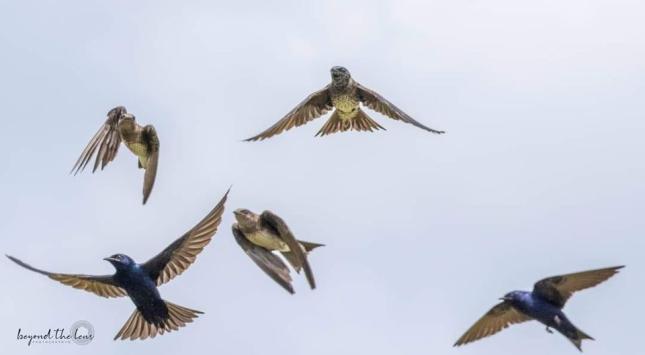 - Purple Martins and other swallows begin congregating at staging grounds before heading south. Purple Martin southward