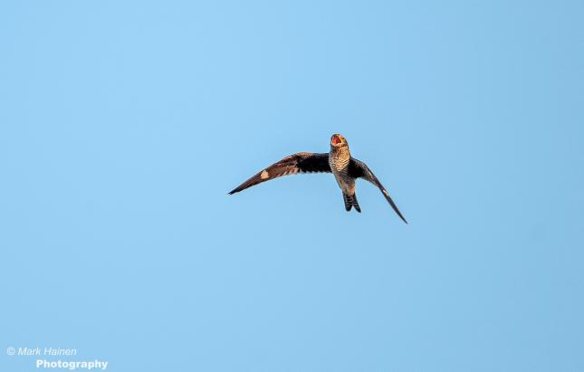 - Flocks of Common Nighthawks can be seen late in the month. Common Nighthawks migrate at all hours of the day in large flocks, on one of the longest migration routes of any North American bird. Most travel over land through Mexico and Central America, although many do pass through Florida and Cuba, flying over the Gulf to reach their wintering grounds in southern South America. This aerial insectivore depends on a healthy insect population. Their numbers have been in decline due in part to pesticide spraying.